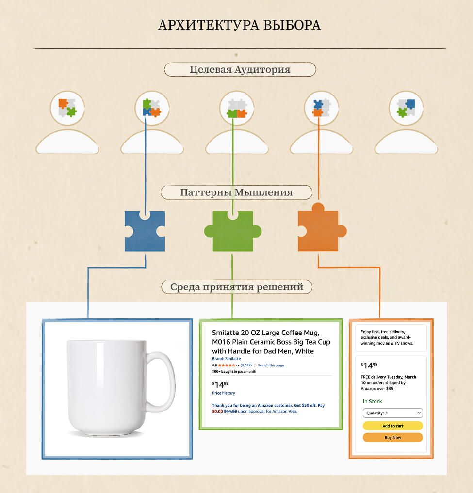 Опираясь на их фундамент, я предложил в своей статье, что в контексте IT и продуктовой разработки choice architecture сводится к двум конкретным элементам: